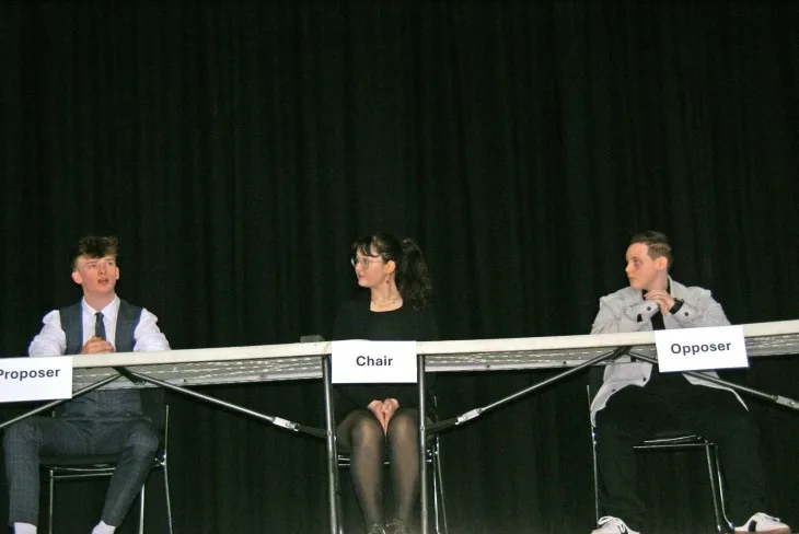 Theo K, Tara F and JJ J on stage for their debate